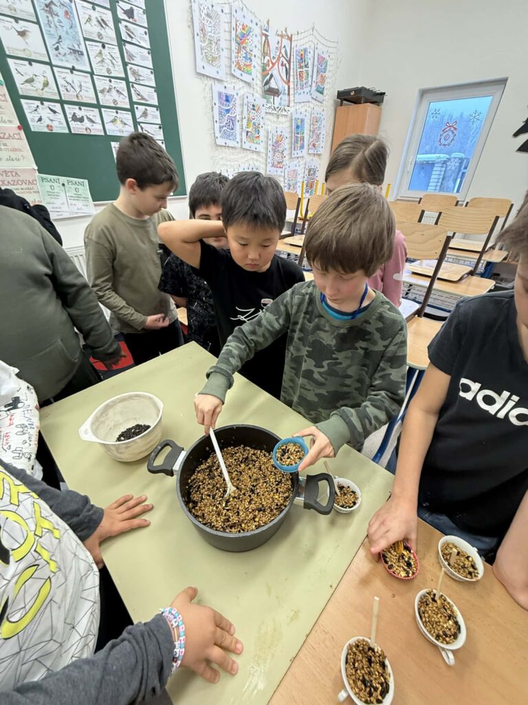 Než samotné pozorování začalo, byla nutná pečlivá příprava. Žáci se s nadšením pustili do výroby nejrůznějších dobrůtek pro naše zpěvné ptáčky. Připravili jsme krmítka a parapety se postupně proměnily v oblíbené ptačí zastávky.