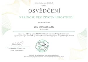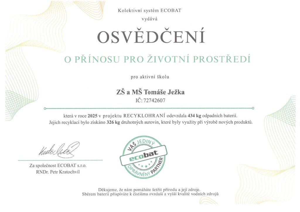Naše příspěvková organizace se i letos s radostí zapojila do projektu Recyklohraní, který podporuje ekologické smýšlení a odpovědný přístup k životnímu prostředí. Díky aktivnímu přístupu se nám podařilo odevzdat celkem 434 kg odpadních baterií.